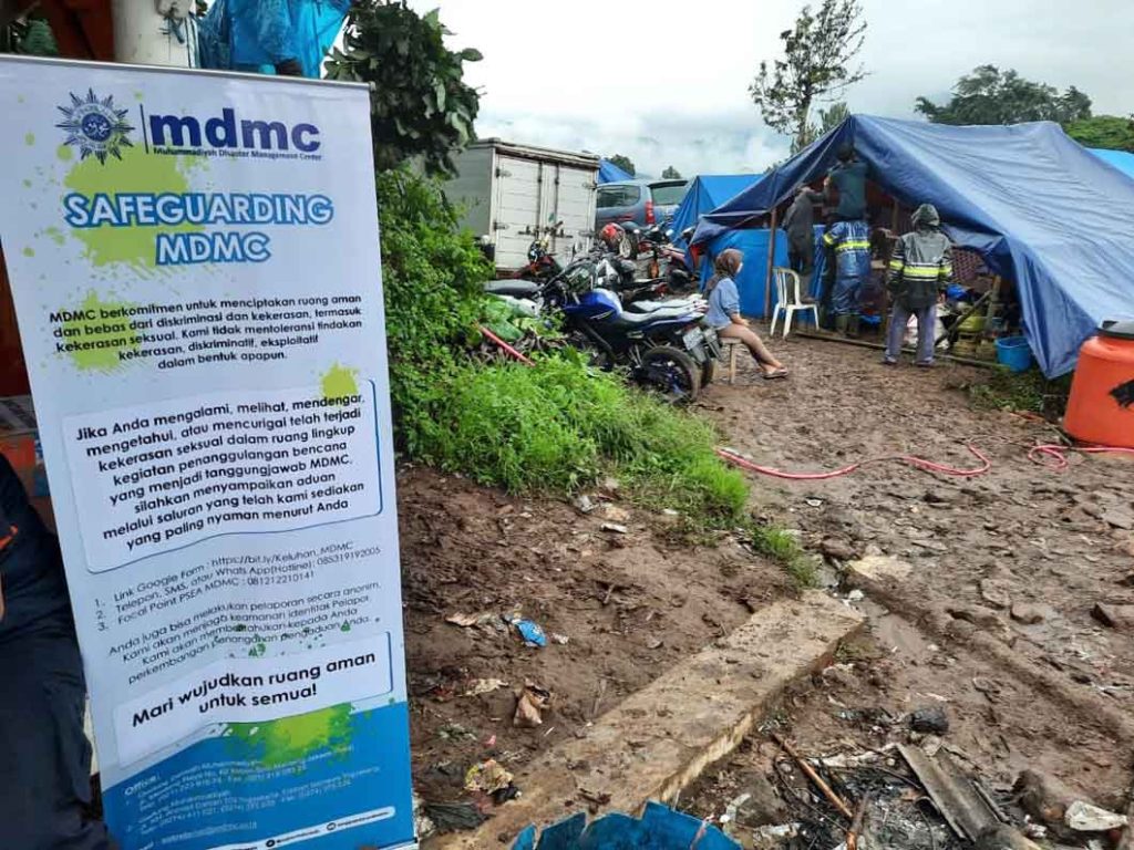 Di pos koordinasi dan pos pelayanan Muhammadiyah di Cianjur saat ini dipasang banner-banner tegak bertuliskan “Safeguarding MDMC”.