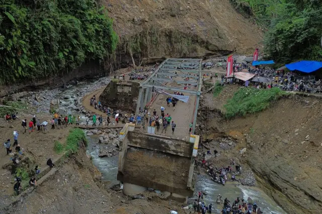 Keterangan gambar,Foto udara warga menyeberangi sungai dengan jembatan darurat di wilayah Tenge Besi, Kecamatan Pintu Rime Gayo, Kabupaten Bener Meriah, Aceh, Sabtu (20/12).